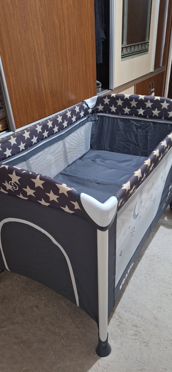 Gri renkli, yıldız desenli yumuşak kenarlıkları ve hava alabilen file panelleri olan bebek oyun parkı yatağıdır. sağlamdır hic bir sorunu yoktur