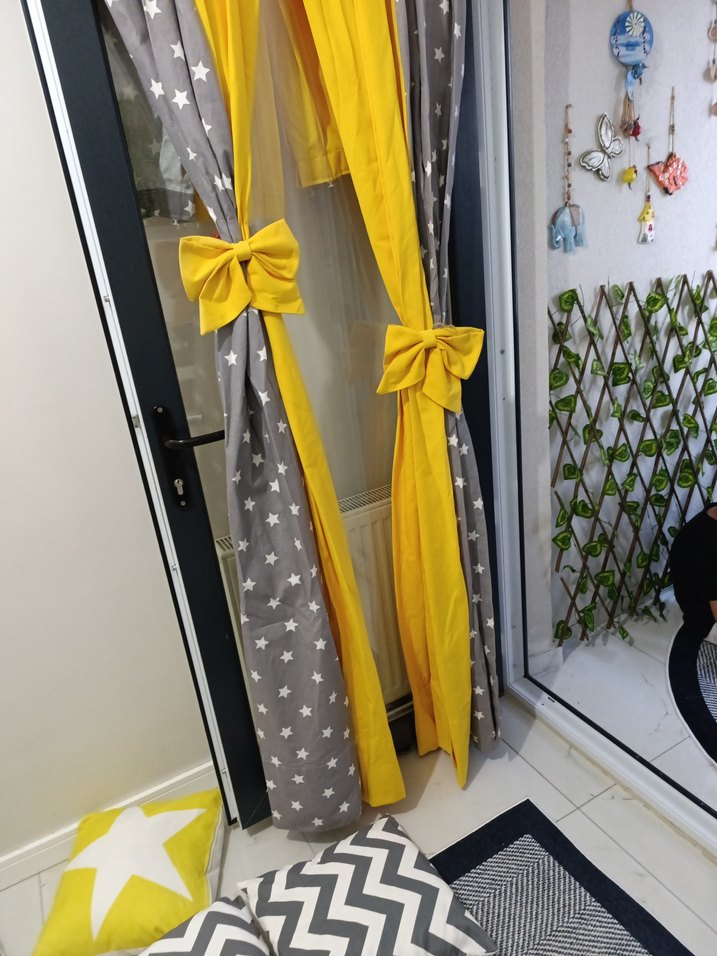 Gri yıldız desenli dış panelleri sarı bağlamalarla tutulan, sarı iç katmanlı çağdaş perde.