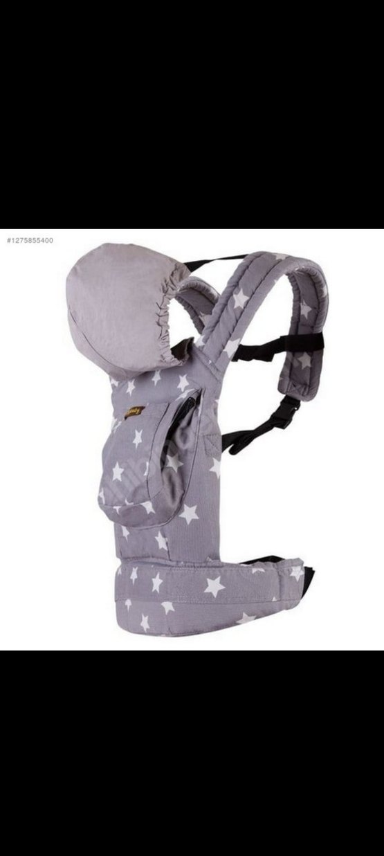 Ayarlanabilir kayışlara ve konfor için kapüşona sahip gri bebek kangurusu, yıldız desenli. Bebek taşıma için uygundur. 20 kiloya kdr tasima kapasitesi vardr sorunsz yepyeni