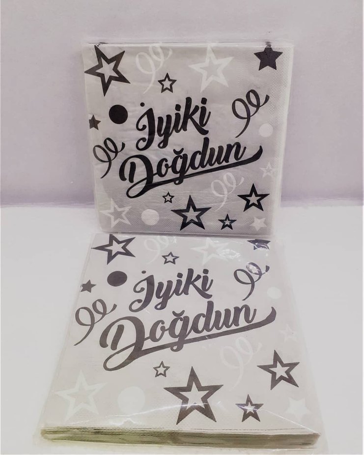 Gri yıldız ve süslemelerle beyaz peçeteler üzerinde "İyiki Doğdun" yazısı bulunur. Doğum günü partileri için uygundur .
