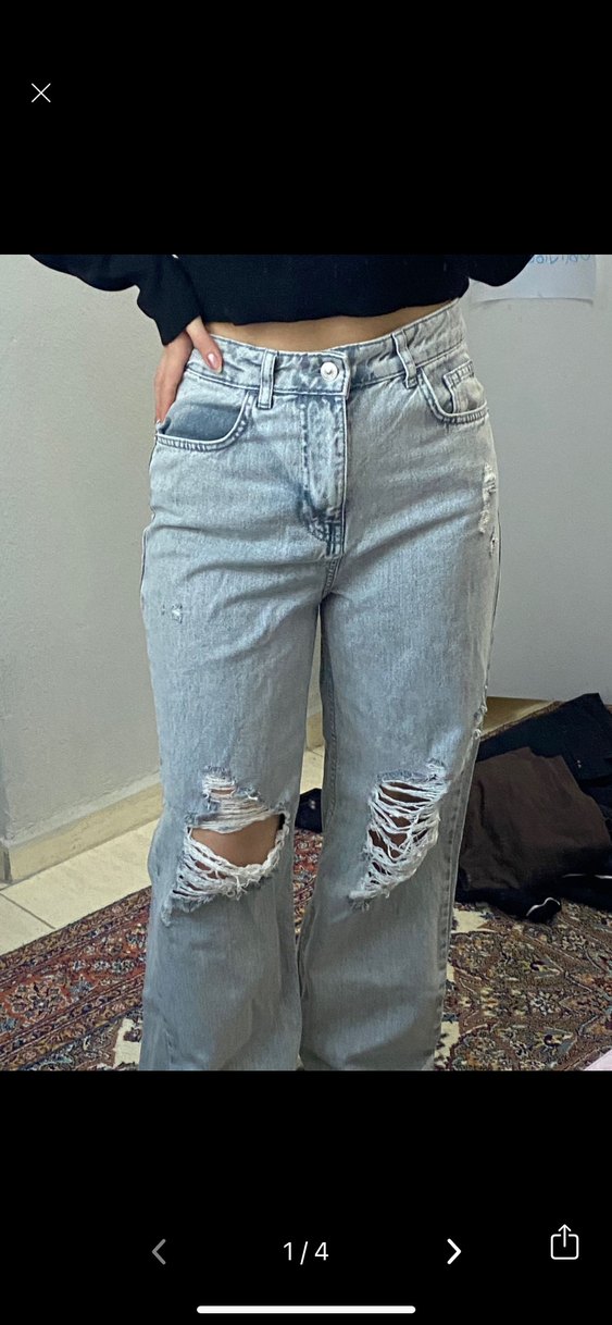 Gri renkli, yırtık detaylı ve tokalı bol kesim denim pantolon, sokak stili ve günlük kullanım için uygundur.