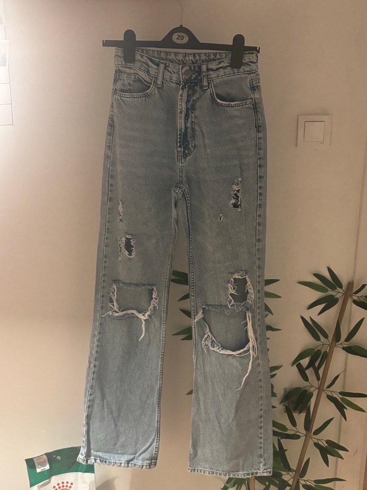 Bol kesim gri denim pantolon, yırtık ve slit detaylarıyla midi boy, günlük sokak stili için uygun.