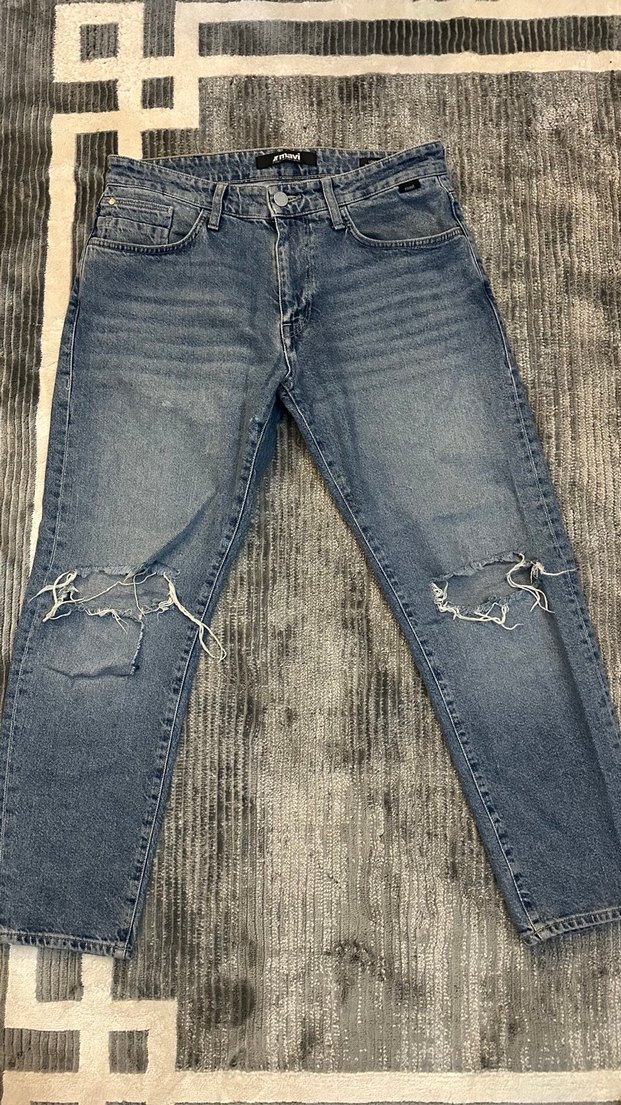 Bol kesim ve dizlerde yırtık detayları bulunan, mavi-gri renkte denim kadın jean. Normal midi boyda, günlük sokak stili için uygun. 45 bel uzunluk 97