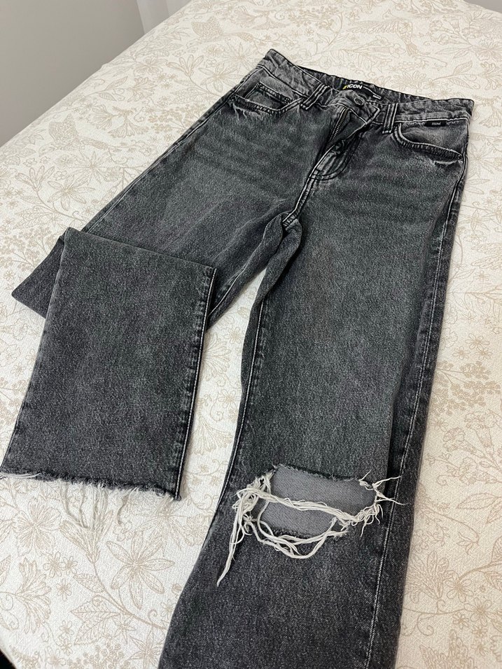 Gri renkli, bol kesim, yırtık detaylı denim kot pantolon. Rahat ve günlük kullanıma uygun.