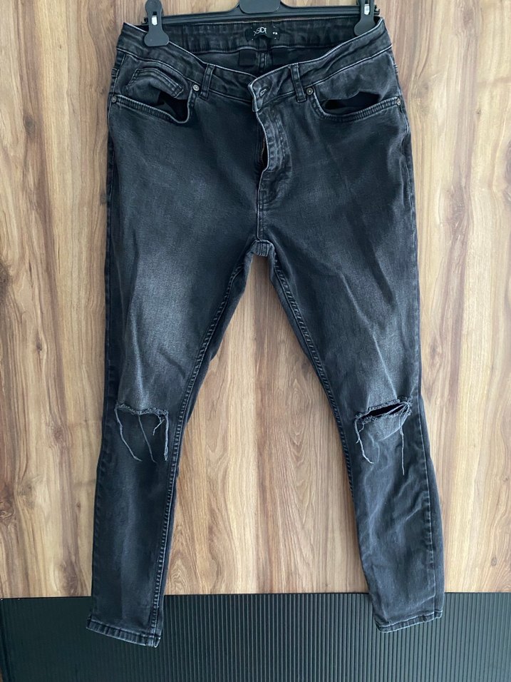Gri renkli, diz kısmında yırtık detaylı, bol kesim erkek denim jean. Günlük kullanıma uygun rahat ve trend bir tarz sunar.