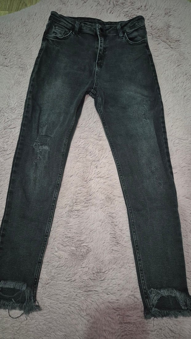 Gri renkli, normal kesim ve midi boyda, yırtık detaylı kadın denim jean. Trendy casual sokak stiline uygun.