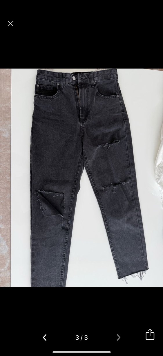 Gri renkte, yırtık detaylı ve kemer tokalı, normal boy ve rahat kesim kadın denim pantolon.