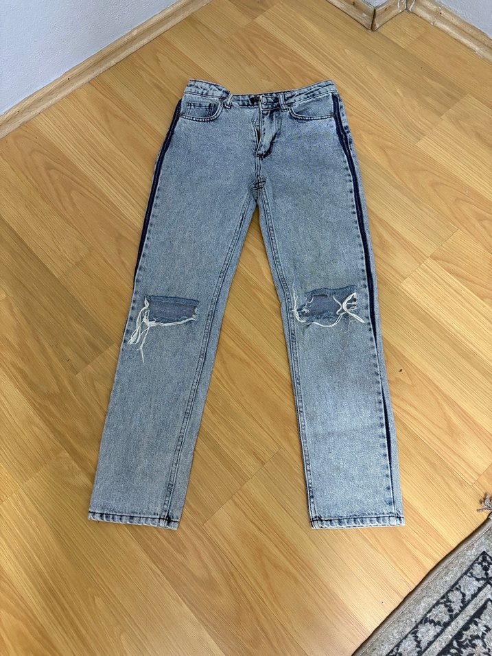 Gri renkte, yırtık detaylı, midi boy ve regular fit kadın denim pantolon. Rahat günlük kullanıma uygun, sokak stili için ideal.