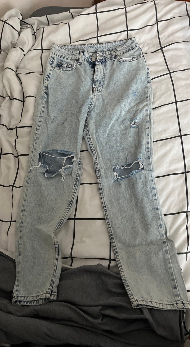 Gri renkte, diz kısmında yırtık detaylı loose fit denim pantolon. Midi boy ve desensiz, günlük kullanıma uygun rahat sokak stili jean.