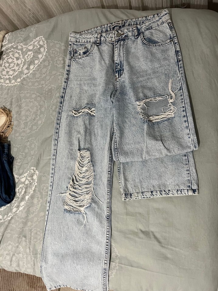 Gri renkli kot pantolon, yırtık detayları ve yan yırtmaçlarıyla rahat ve salaş bir kesime sahip. Midi boyuyla günlük sokak stili için uygun.
