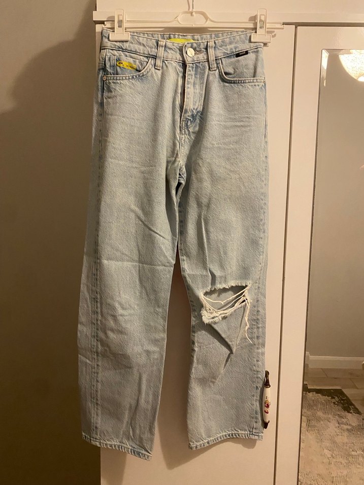Gri renkli, rahat kesim kadın kot pantolon, yırtık detaylı ve midi boyda. Günlük kullanıma uygun, salaş sokak stiliyle uyumlu.