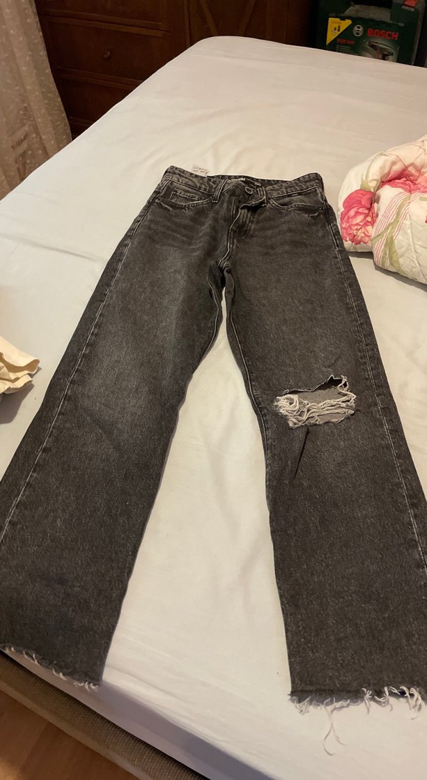 Gri renkte, yırtık detaylı ve salaş kesime sahip midi uzunlukta kadın jean. Günlük sokak stili için uygundur.
