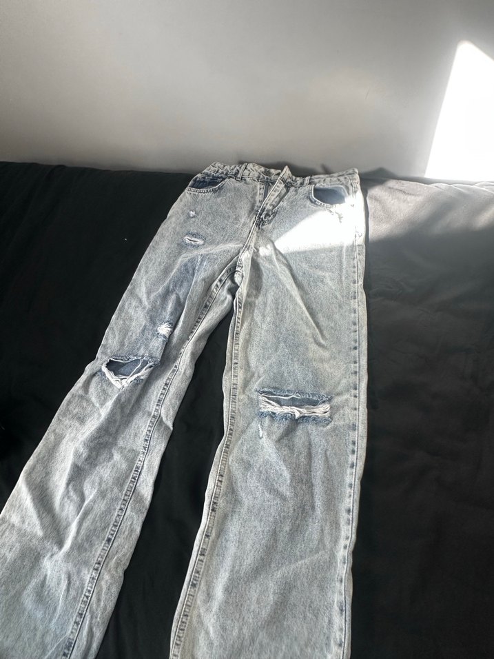 Salaş kesim, gri denim kadın jean. Yırtık ve slit detaylarıyla günlük sokak stiline uygun, midi boyda rahat bir model.