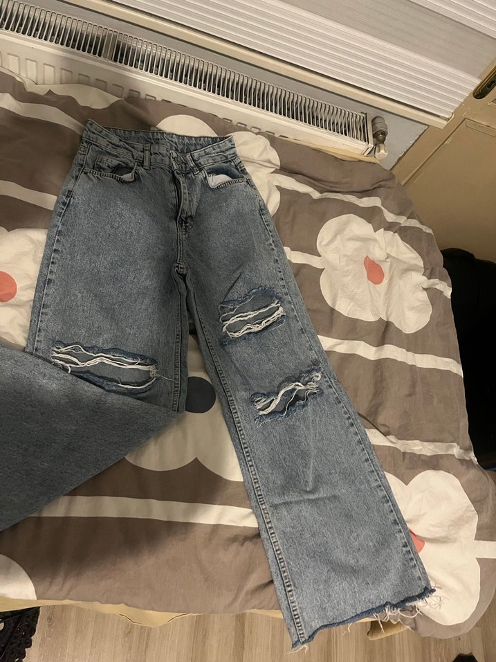 Gri renkte, yırtık detaylı ve yan yırtmaçlı salaş kesim kadın kot pantolon. Midi boyda, günlük kullanıma uygun rahat bir modeldir.