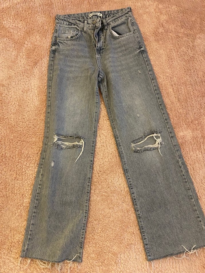 Gri denim kot pantolon, salaş kesim ve yırtık detaylarla dikkat çekiyor. Yırtmaç ve tie-dye deseni günlük sokak stiline uygun.