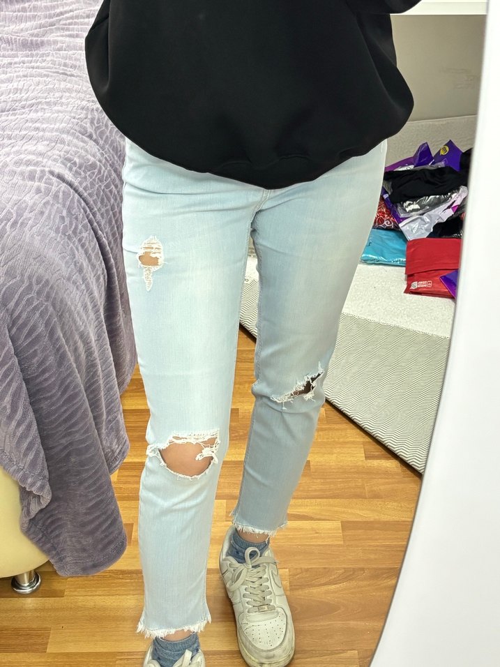 Pastel gri renkte, yırtık detaylı, salaş kesim midi boy kadın kot pantolon. Rahat ve şık sokak stili için uygundur.