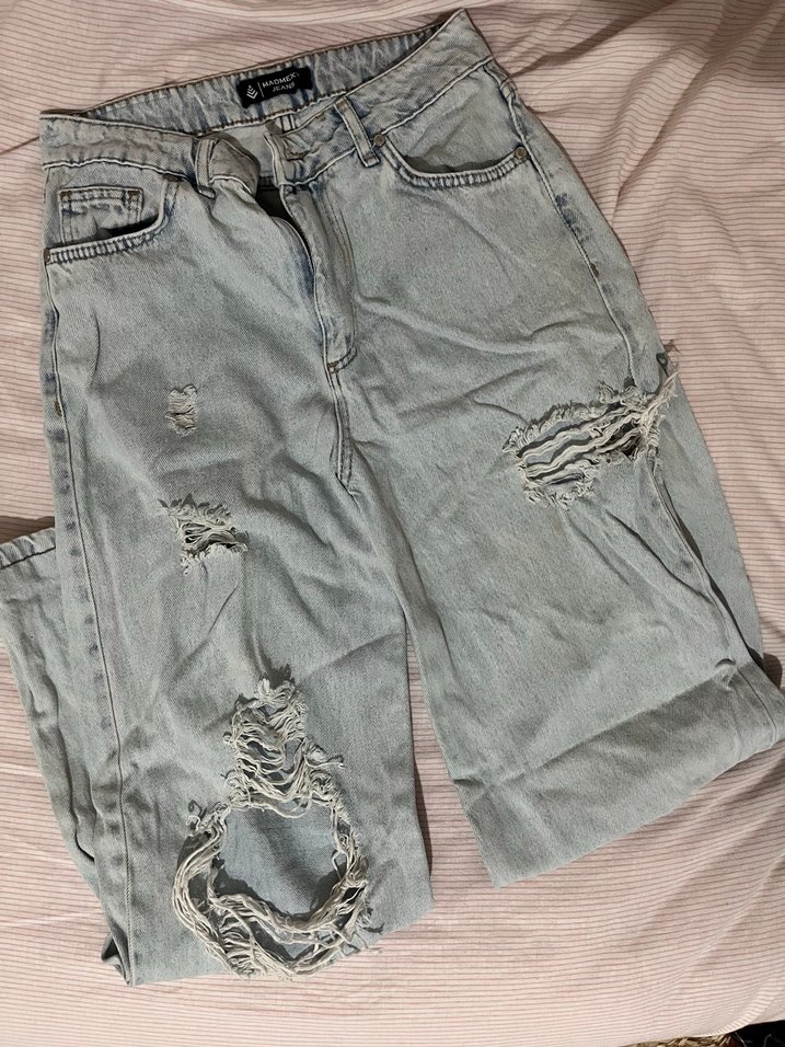 Gri renkte, midi boyda ve bol kesim denim kot pantolon. Yırtık detaylarıyla rahat ve şık bir günlük stil sunar.