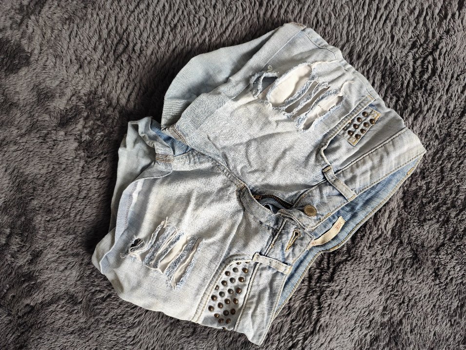 Gri renkli, düğmeli, yırtık detaylı ve perçin süslemeli, bol kesim mini kadın denim şort.