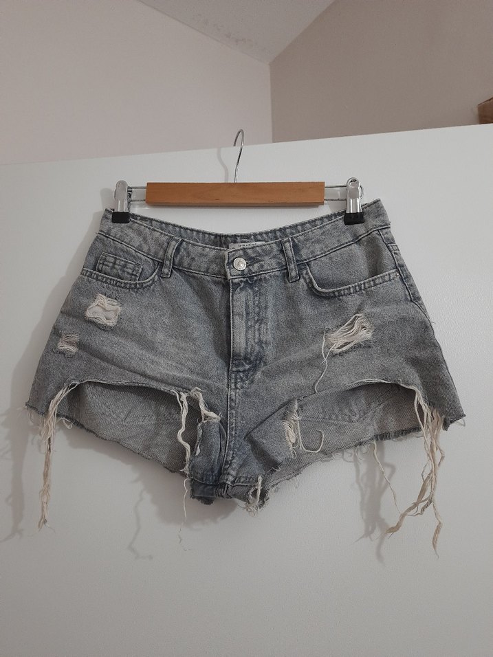 Grimsi mavimsi kot kumaştan, salaş kesim ve yırtık detaylara sahip, tokalı mini şort. Trendy ve rahat sokak stili için uygundur.