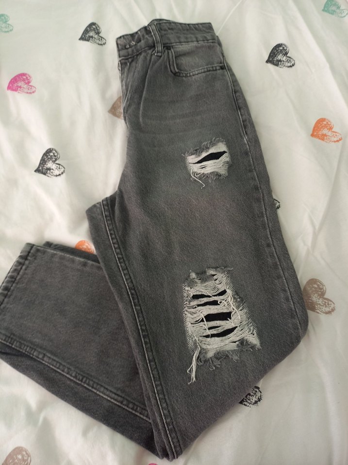 Bol kesim gri denim kot pantolon, yırtık detaylar ve tokalı aksanlarla günlük sokak stili için uygun. fermuarı kopuk s-m