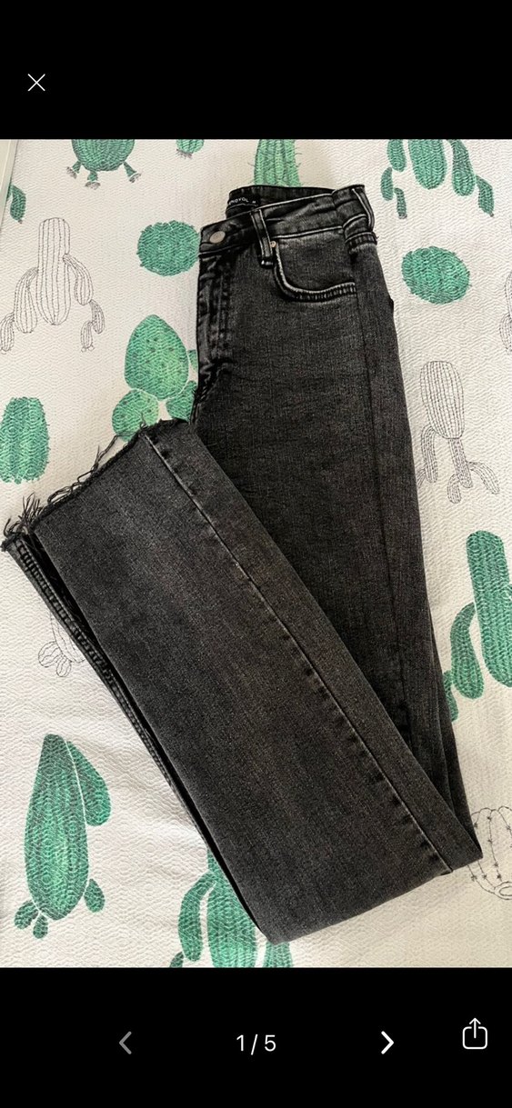 Nakışlı gri denim pantolon, regular fit ve uzun paça, yırtmaç detaylıdır. Günlük rahat sokak stili için uygundur.