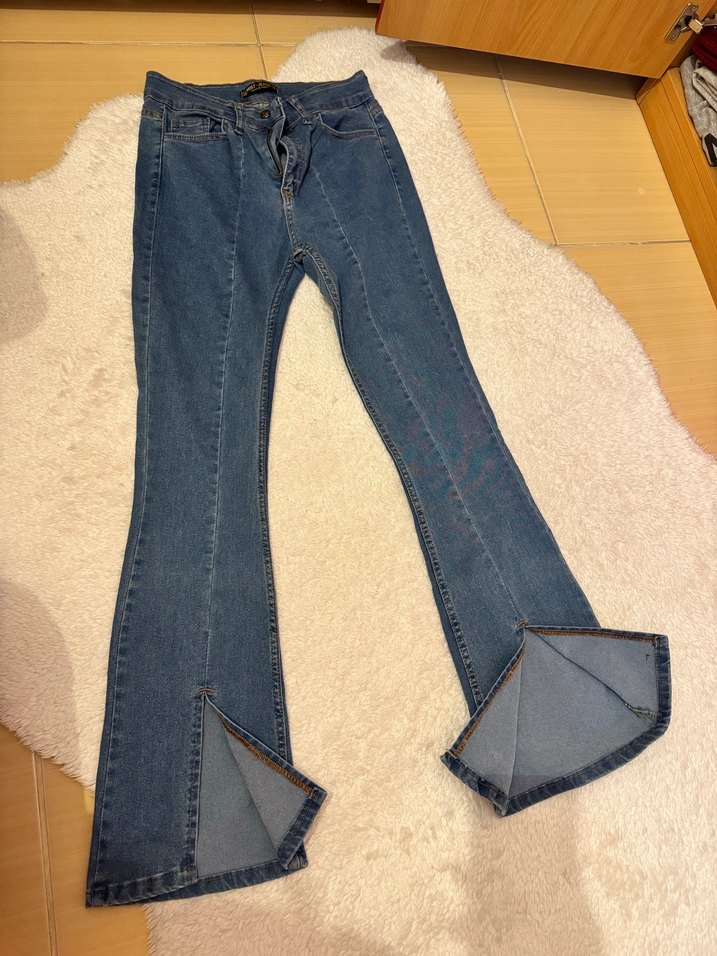 Mavi renkte, yırtmaçlı ve bol kesim midi uzunluğunda denim kot pantolon. Günlük kullanım için uygun rahat bir model.