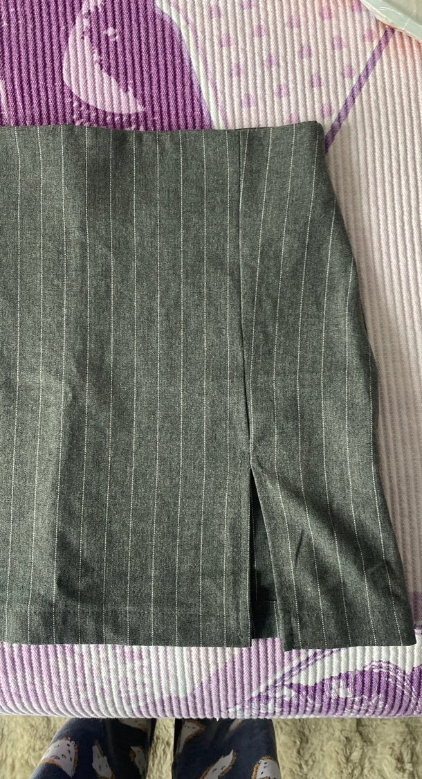 Gri renkte, piliseli detaylı, normal boy midi hamile etek. Sentetik kumaştan, rahat kesim ve iş ortamı için uygun tarzda.