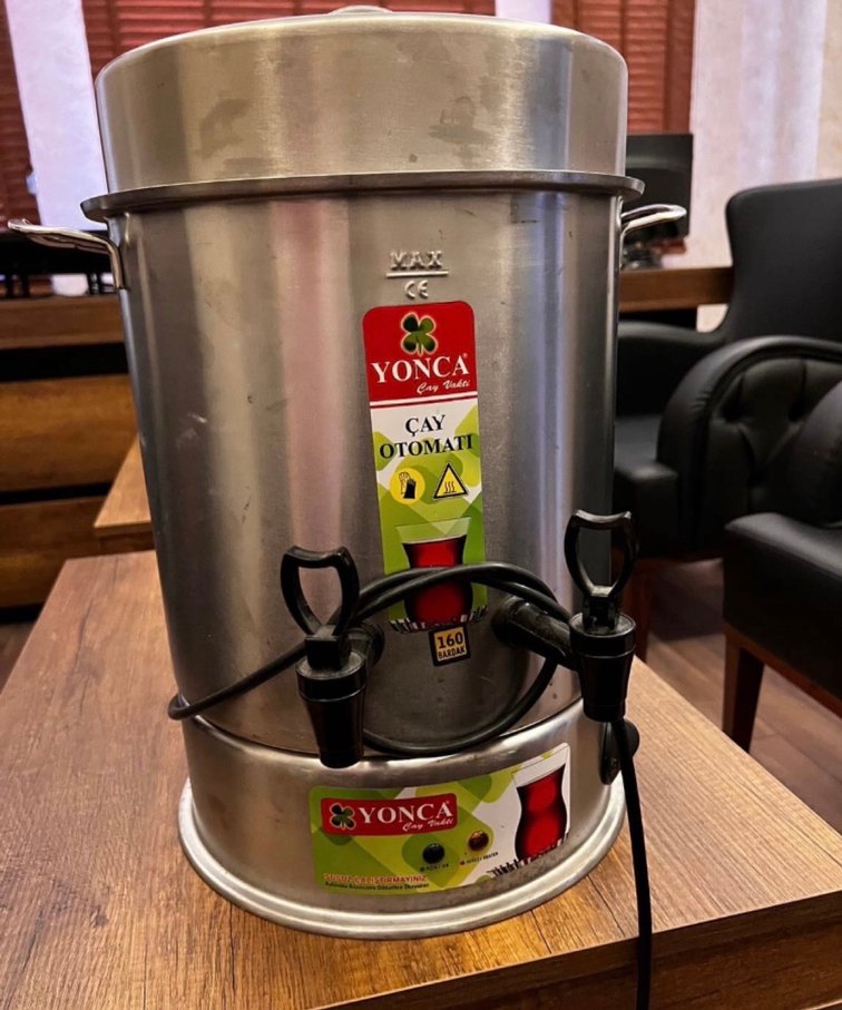 Gri renkli Yonca çay otomatı, paslanmaz çelik gövde ve iki musluk ile çay demleyip servis yapmaya uygundur. ☕