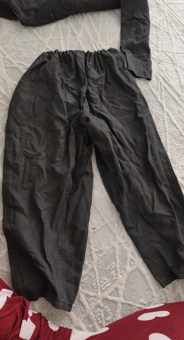 Kadınlar için keten kumaştan, bel kemerli, gri renkte bol kesim, normal boy midi pantolon.