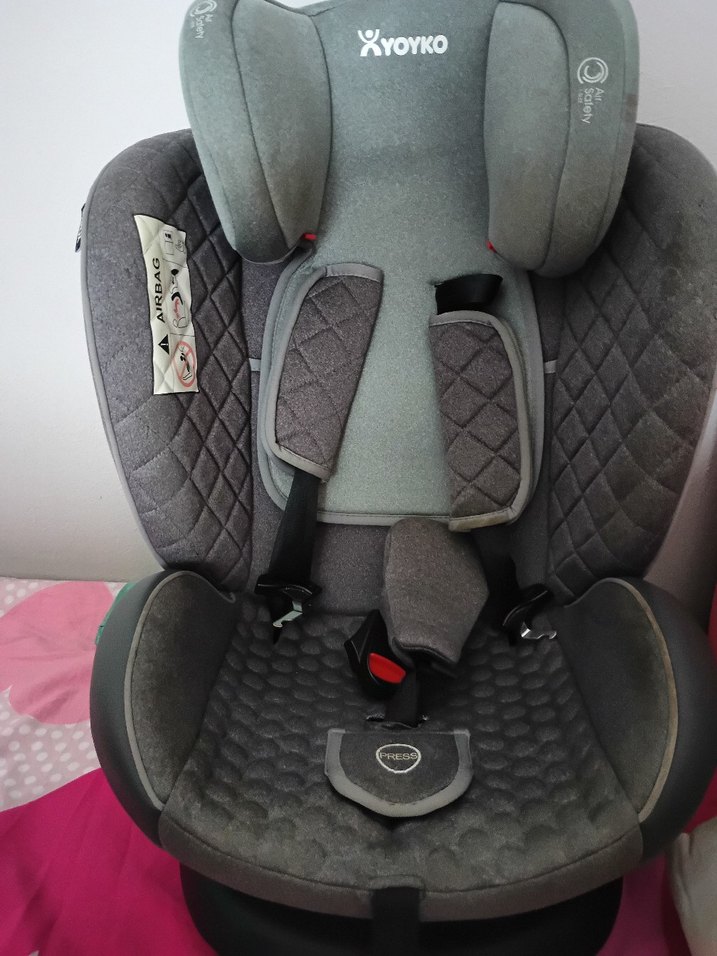 Gri YoyoKo çocuk oto koltuğu, yastıklı yan destekler ve güvenli emniyet kemeri sistemi sunar. Rahat kapitone dolgu ve ayarlanabilir kayışlara sahiptir.