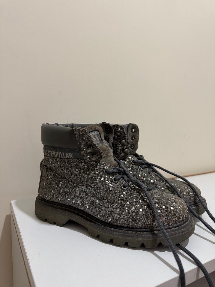 Gri yılan desenli, parlak detaylı yüksek topuklu botlar. Kauçuk malzemeden üretilmiş, rock punk havasında sokak tarzı için uygun.