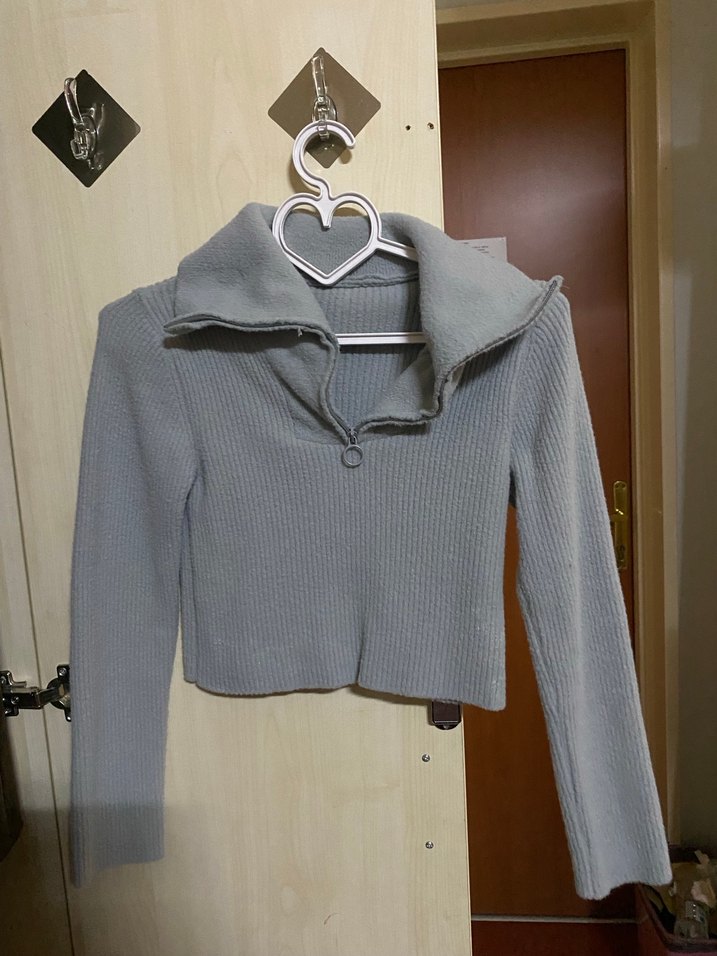 Gri renkte, örgüden yapılmış, yüksek yakalı ve uzun kollu, normal crop boyda kadın kazak. Rahat ve desen içermeyen, sokak stiline uygun bir tasarım. Yakası açık da kullanılabilir