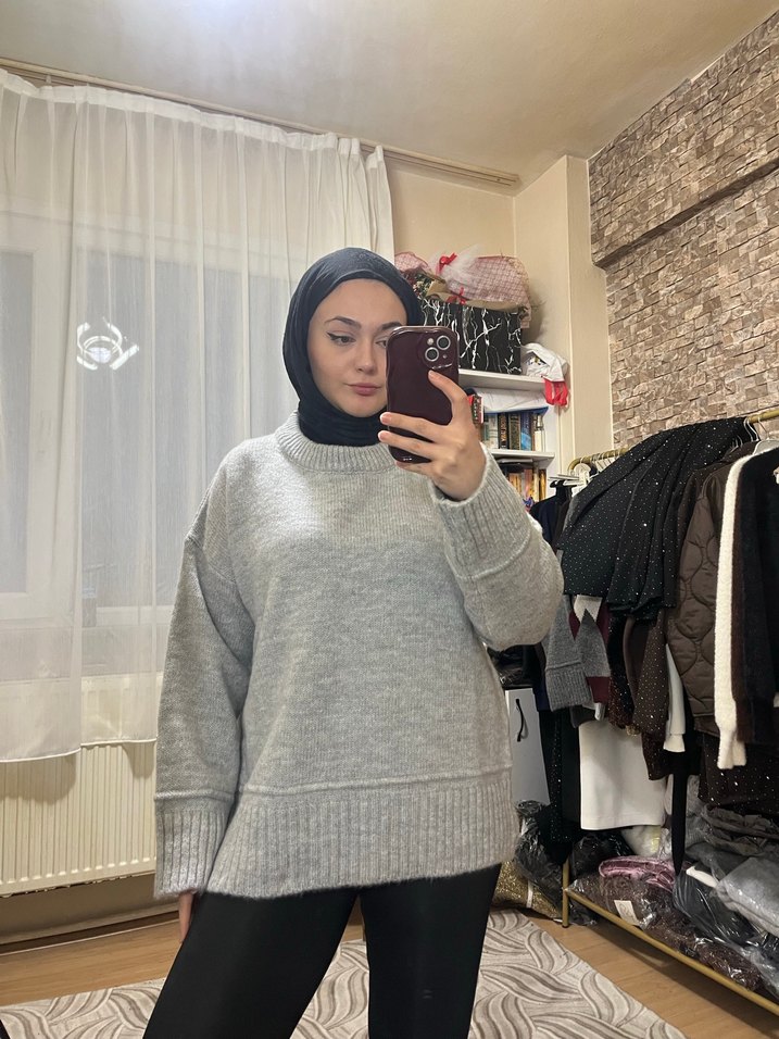 Gri renkte, yüksek yakalı ve uzun kollu, rahat kesime sahip normal uzunlukta triko kazak. Desensiz, sade tasarımıyla günlük kullanıma uygundur.