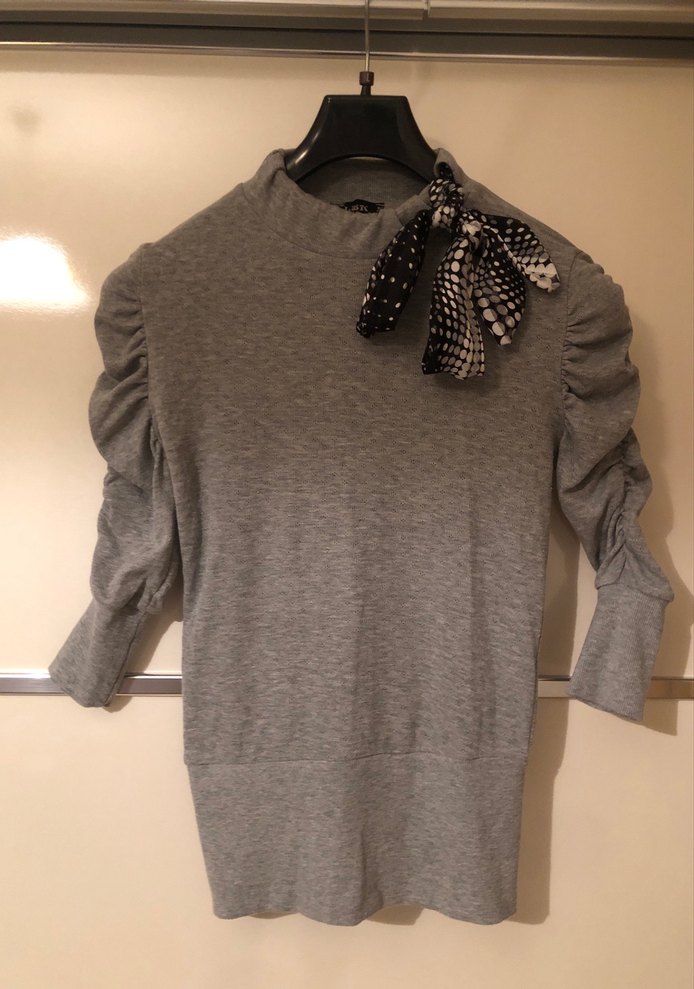 Fitted kesim gri kazak, uzun kollu ve büzgülü detaylıdır. Örme kumaştan, hafif batik desenlidir ve siyah-beyaz fular detayıyla tamamlanmıştır,iki omuz 42cm.iki kol aradı 67cm boy 67cm