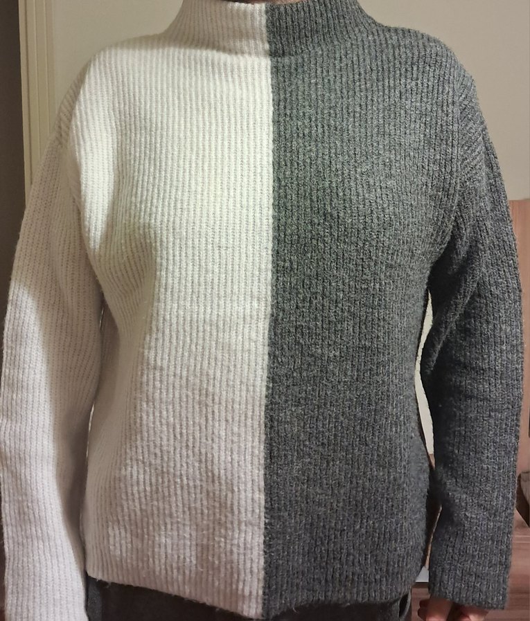 Yüksek yakalı, uzun kollu, bol kesim kadın kazak. Gri ve beyaz renklerde, rahat triko kumaştan, günlük kullanıma uygun. Koltuk altı arası 65 cm Kol uzunluğu omuzdan 58 cm Omuzdan aşağıya doğru 65 cm