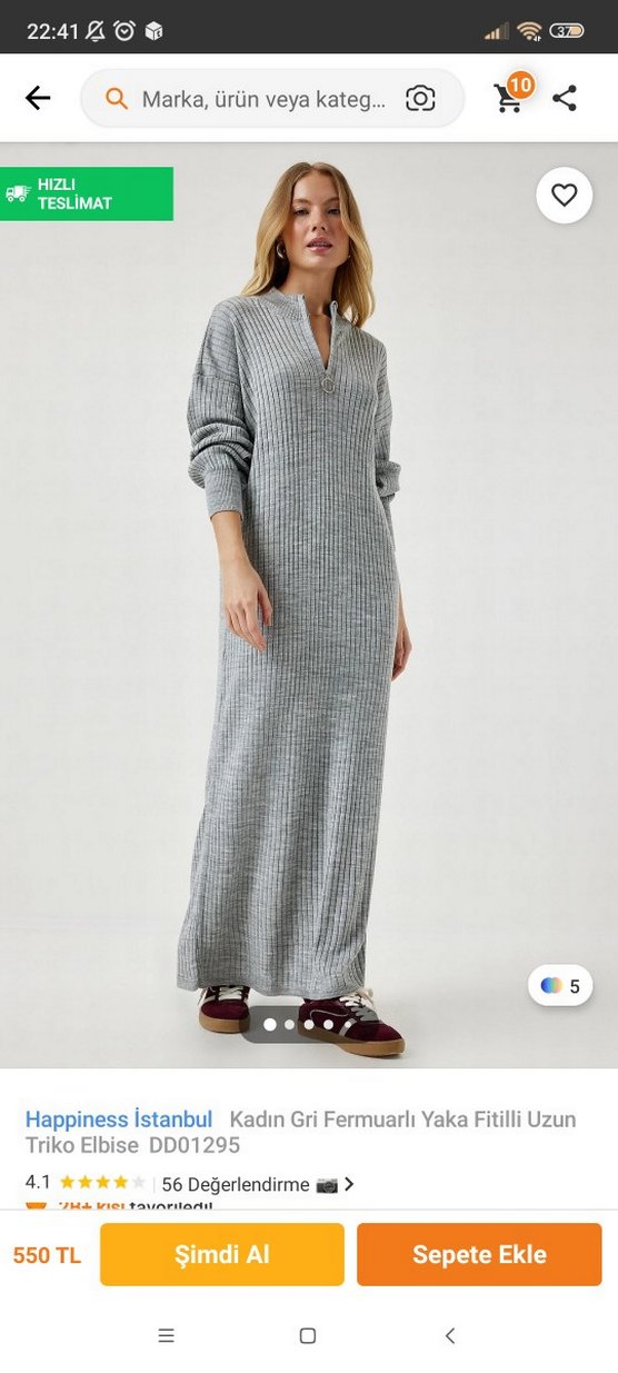 Gri renkte, yüksek yakalı ve uzun kollu, yumuşak triko kumaştan üretilmiş uzun, bol kesim elbisedir. Desensiz yapısıyla günlük kullanıma uygundur.
