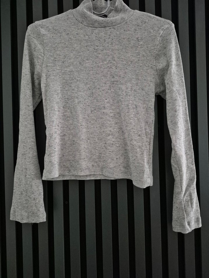 Gri renkli, yüksek yakalı ve uzun kollu bluz desen içermeyen minimal tasarım.