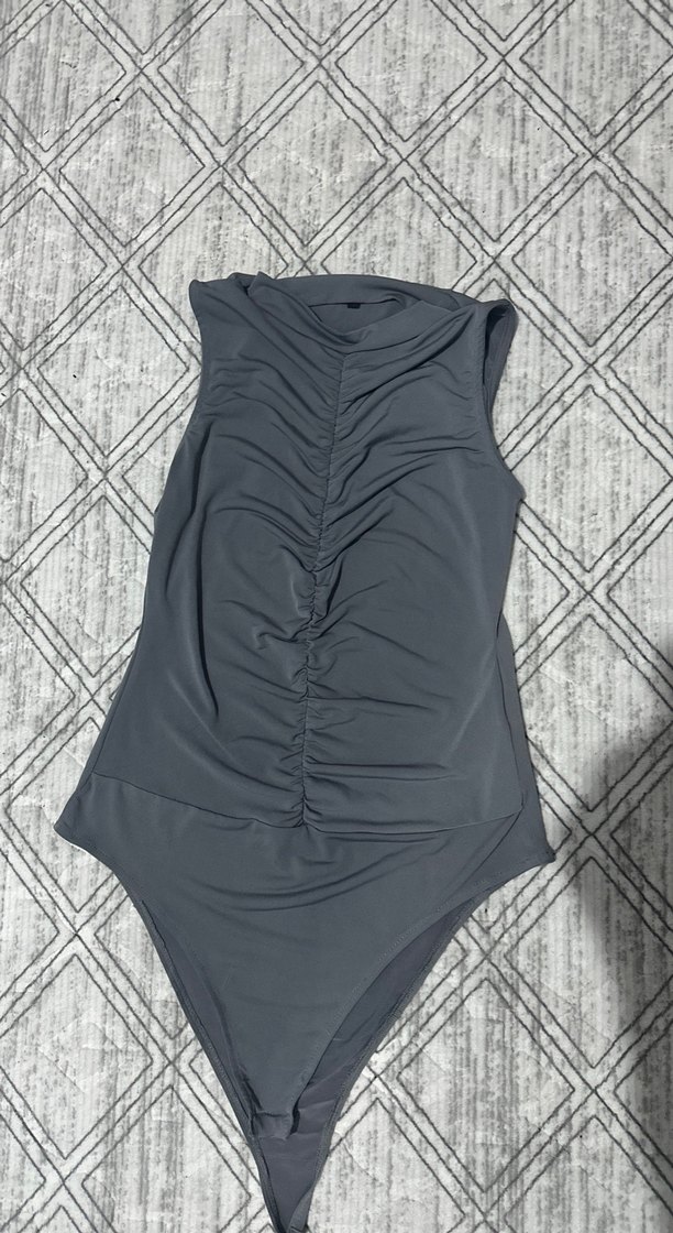 Gri renkte, yüksek yakalı, kolsuz ve vücuda oturan bodysuit. Ön kısmı büzgülü ve normal midi uzunluğundadır.