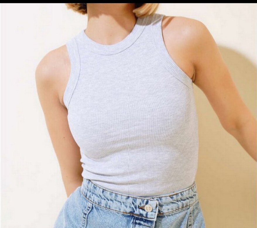 Yüksek yakalı, fitted kesim gri denim atlet. Kolsuz tasarımı ve rahat sokak stiliyle günlük kullanıma uygundur.