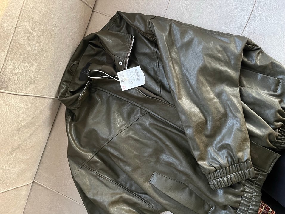 Gri renk, yüksek yakalı ve uzun kollu deri ceket. Bol kesim ve fermuarlı ön detaylara sahip, günlük sokak stili için uygun.