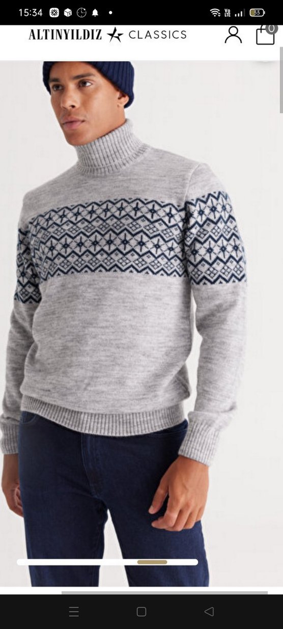 Gri ve lacivert geometrik desenli, yüksek yakalı örgü yün erkek kazak. Normal kesim ve uzun kollu, günlük kullanıma uygun.koltuk altından diğerine 52 cm