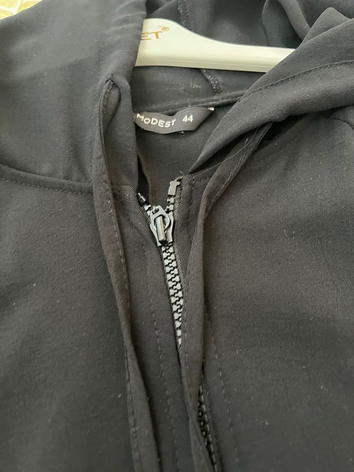 Bu dar kesim hamile ceketi, yüksek yakalı ve fermuarlı kapamaya sahiptir. Gri renkte, düz ve sentetik kumaştan yapılmıştır. Sokak modasına uygun, kolsuz ve midi boyda, rahat athleisure tarzını yansıtır.