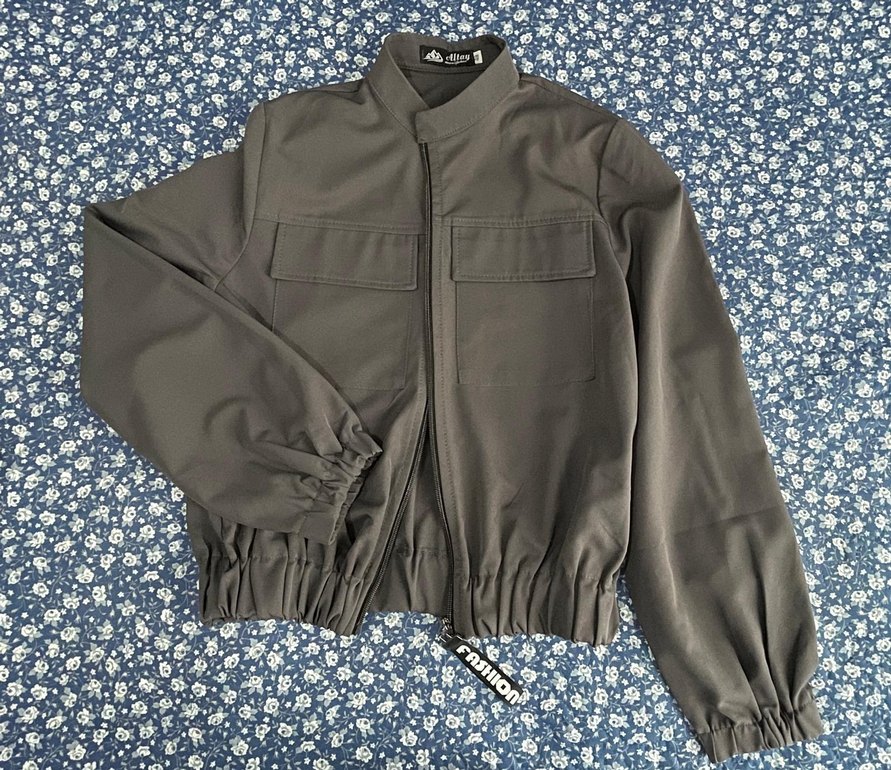 Gri renkli, yüksek yakalı ve fermuarlı kadın eşofman takımı. Uzun kollu, bol kesim ve normal boyda. Sentetik kumaştan, günlük sokak stili için uygun.