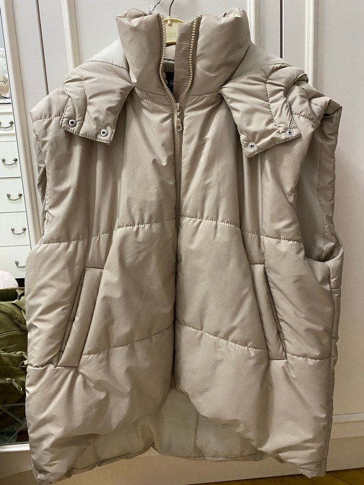 Gri renk, yüksek yakalı ve fermuarlı, kolu olmayan, bol kesim ve yumuşak dokulu rahat kumaştan kadın yelek. Günlük sokak stili için uygun.
