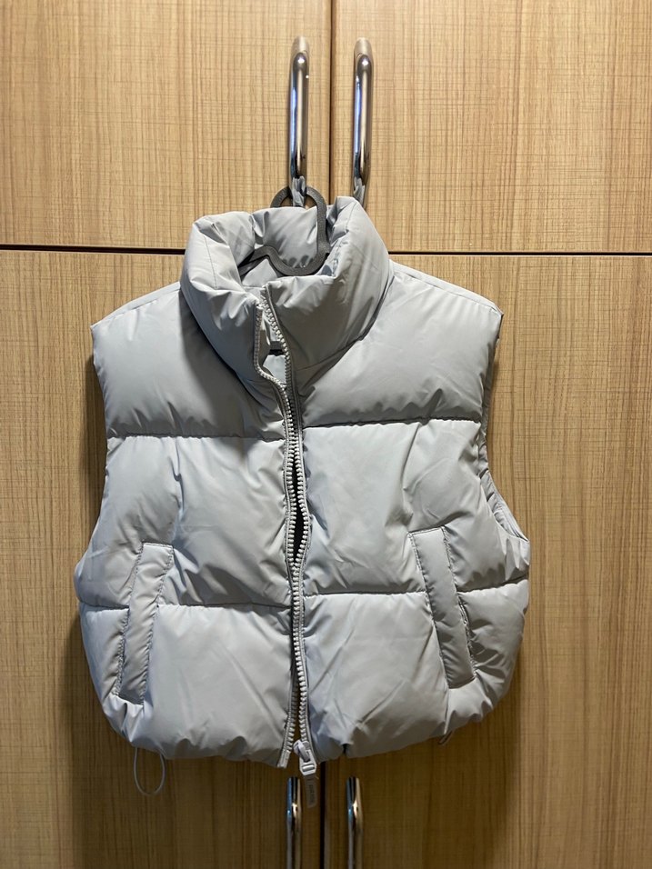 Yumuşak kumaştan yapılmış, fermuarlı ve yüksek yakalı gri kadın yeleği. Sokak tarzına uygun, rahat ve fit kesim, günlük kullanıma uygun.