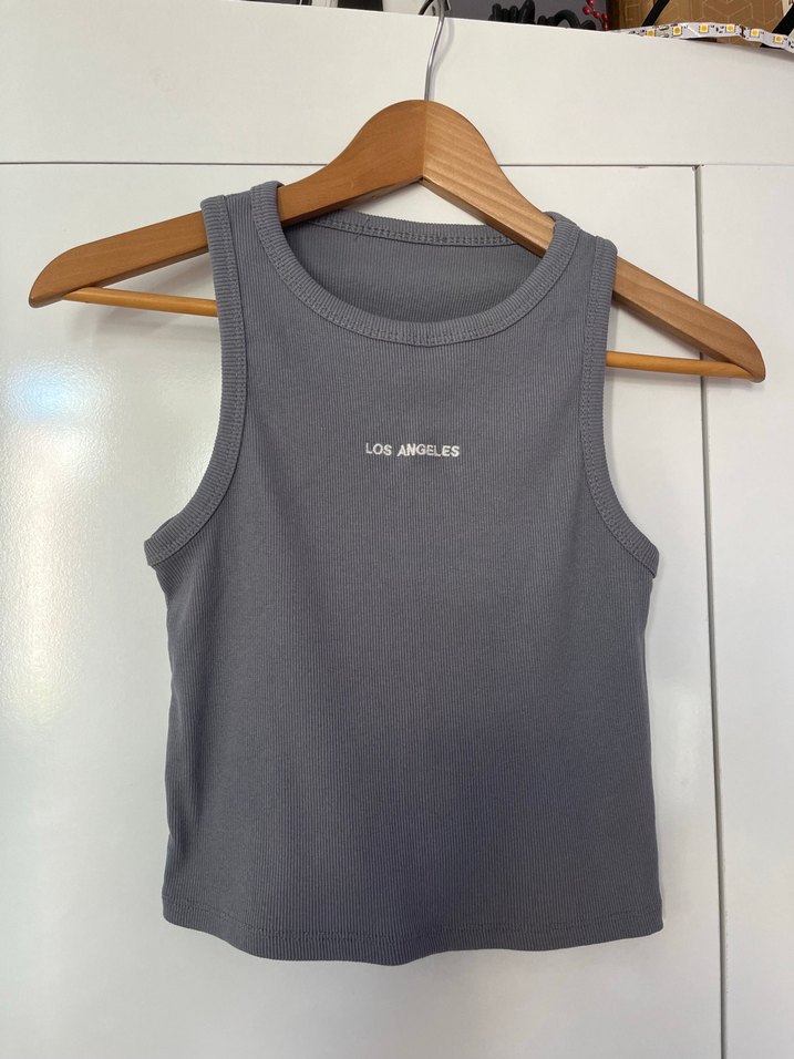 Yüksek yakalı, kolsuz ve ince kesimli bu gri kadın atlet, yumuşak keten kumaştan yapılmıştır. "LOS ANGELES" baskısı ve sokak stili tasarımıyla günlük kullanıma uygundur.