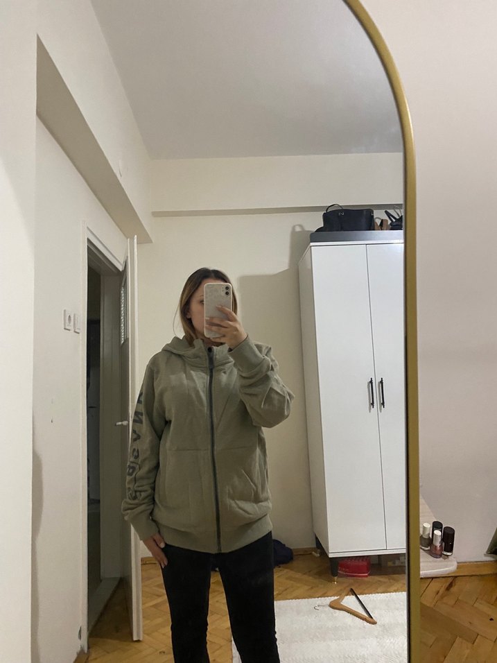 Gri renkli, yüksek yakalı ve uzun kollu kadın sweatshirtü. Bol kesimi ve midi boyu ile rahat ve şık bir görünüm sunar.