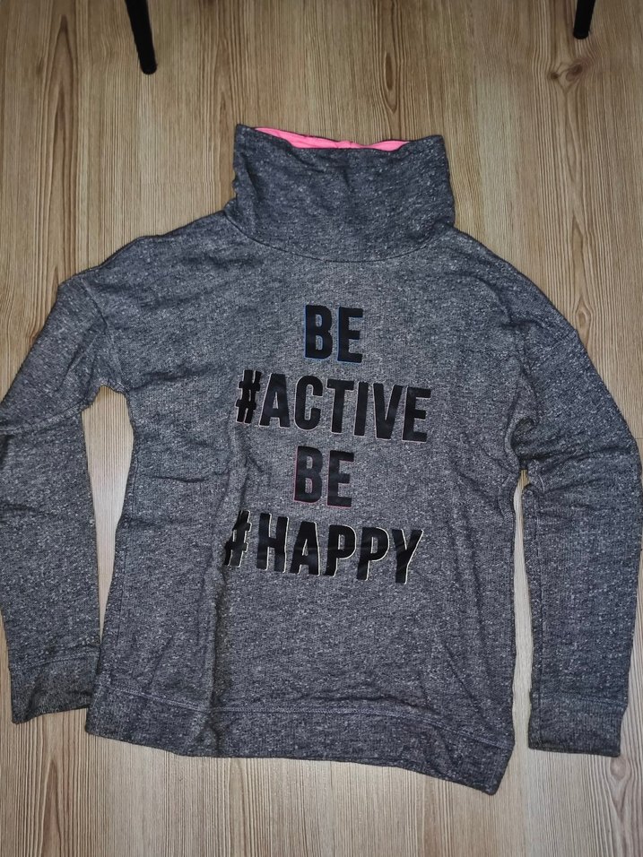 Gri renkli, yüksek yakalı ve uzun kollu kadın sweatshirtü. Örgü dokulu, yumuşak ve rahat fleece kumaştan üretilmiştir. Önünde "BE #ACTIVE BE #HAPPY" yazılı baskı bulunur. Arka omuz kısmında küçük bir defo var, görsellere ekledim.