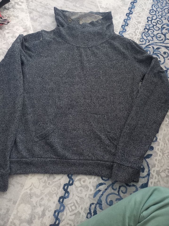 Gri renkte, yüksek yakalı, uzun kollu, keten kumaştan örme ve bol kesim kadın triko. Normal boyda, desensiz ve rahat günlük kullanım için uygundur.