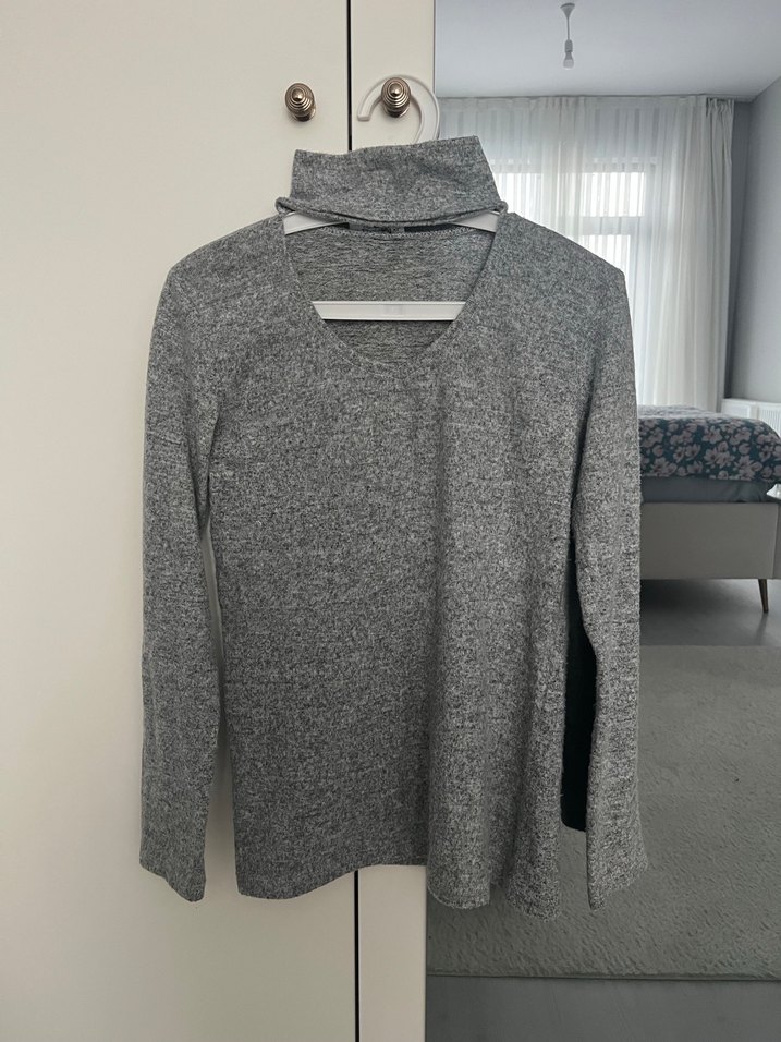 Gri renkte, yüksek yakalı ve uzun kollu örgü triko, rahat ve şık bir görünüm sunar. Günlük kullanıma uygun, yumuşak ve sıcak tutan kumaştan yapılmıştır.